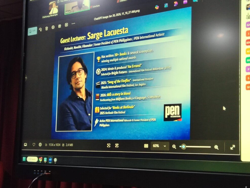 වැඩමුළුවේ ප්රධාන දේශනය පැවැත්වූයේ පිලිපීනයේ සම්මානනීය මාධ්යවේදියෙකු සහ සාහිත්යධරයෙකු වන අමාඩෝ ඇන්ජලෝ සර්ඡ් රොඩ්රිගුස් ලකුඊස්ටා (Amado Angelo “Sarge” Lacuesta) මහතායි. ඔහු පිලිපීනයේ Esquire සඟරාවේ සංස්කාරකවරයා ලෙසත්, පෙන් ඉන්ටර්නැෂනල් ආයතනයේ විධායක සභිකයෙකු ලෙසත් කටයුතු කරන, ජාත්යන්තරව පිළිගත් චරිතයක්.